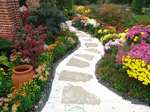 蜿蜒的園路、白色的石子、紅色的陶罐、盛開的菊花