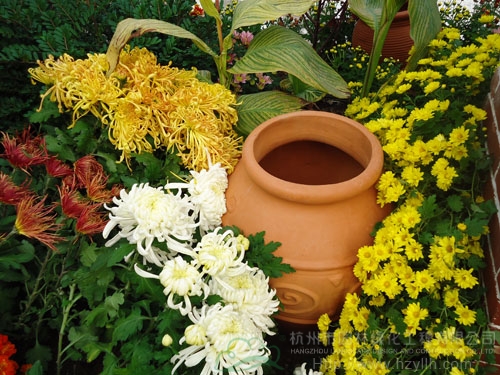 被菊花包圍的紅陶瓷罐