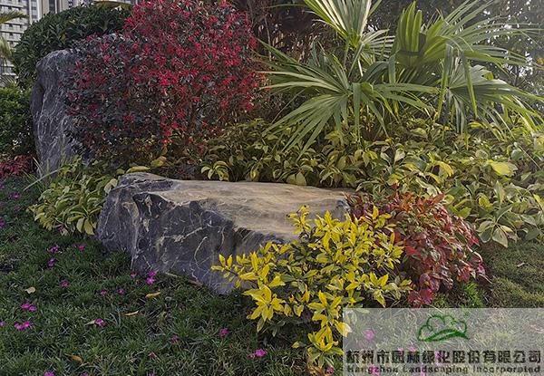 項(xiàng)目中應(yīng)用了許多景石,為了避免出現(xiàn)視覺的疲憊,每塊景石的形態(tài)、大小、植物配置都各有千秋。在一些入口和節(jié)點(diǎn)處,通過景石與色葉植物、開花植物、球類植物的有機(jī)搭配,營造出一個個意趣盎然的花境景觀。
